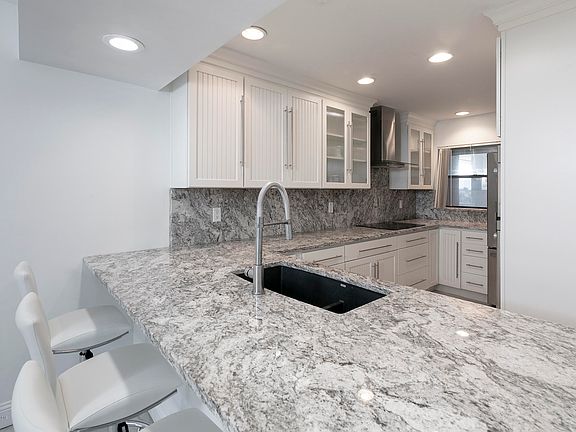 Across from the Atlantic, brilliant ocean views accent contemporary updates in this chic 4th-floor condo. Muted marbled tile floors underscore the entire unit. A sleek modern granite b-fast bar kitchen showcases new GE Profile SS appliances, crisp white soft-close cabinetry w/glass doors, brushed nickel hardware, convection wall oven & micro. A slider off open living & dining leads to a balcony & water vistas. More blue ocean views, double quartz vanities, a stylish tiled shower & 2 closets hallmark the gracious owner's suite. A 2nd bdrm. & next-door bath are ideal for guests. The washer & dryer are discreetly located in a closet off the kitchen. A 1-car detached garage, storage & shutters are included. Stay active at the community pool, tennis cts., fitness rm. & clubhouse!