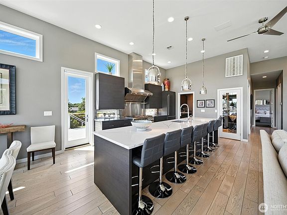 Sleek, modern design and sweeping Blue Mountain views define this stunning home. The open floor plan features a floating staircase and glass-enclosed wine room as a striking focal point. A chef’s kitchen impresses with an oversized island, premium appliances, and butler’s pantry with wet bar. The great room is filled with light and opens to expansive balconies perfect for entertaining. The luxurious primary suite offers a spa-like bath, walk-through closet, and private balcony. Downstairs, enjoy two ensuite bedrooms, office, den, and patios each floor has its own full laundry room. Set on a quiet street of distinctive contemporary homes.