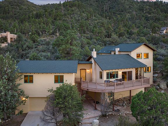 Fabulous home situated on an elevated lot boasting unsurpassed forever views including, Thumb Butte, Granite Mountain, the Bradshaw Range, San Francisco Peaks, Granite Dells, andMingus Mountain and located just a stone's throw from Prescott National Forest! The property abounds with mature towering pine trees and Ponderosas and massive boulder outcroppings in an extremely private park like setting but is only 10 min from Historic downtown Prescott! Interior features stain grade doors, Levolor pleated shades, wood casement windows, and real wood floors throughout the majority of the home. Upon entrance you are greeted by an expansive family room with beautiful woodwork, exposedbeams, a gas fireplace, and a wall of windows on the north side. CONTINUE