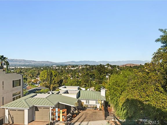 Nestled into the hillside on a quiet street in Woodland Hills, this gated corner lot property offers breathtaking views of the Valley and surrounding hills. Step inside to a spacious living room that's flooded with natural light, accentuating the warmth of the original hardwood floors. At the heart of the home lies a designer chef's kitchen, featuring high-end JennAir appliances, gorgeous marble countertops, a hidden walk-in pantry and inviting breakfast nook. Two sets of French doors lead out to a private covered patio with an in-ground spa, the perfect place to relax and soak in the unobstructed views. This home consists of four generously sized bedrooms (two on each level) and three full bathrooms (two on the main level and one upstairs). Each bedroom has its own walk-in closet, ensuring ample storage throughout. Additional highlights include a laundry closet, EV charger, wrap around front patio and oversized two-car garage with an overhang for additional covered parking. Ideally located south of the Boulevard, enjoy easy access to local shops/restaurants, the Woodland Hills Country Club and so much more.