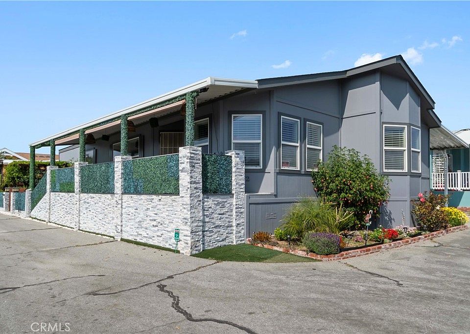 Experience luxury living in this beautifully upgraded 3-bedroom, 2-bathroom, 1,624 sq ft home nestled in Chatsworth Mobile Home Park. The attached carport accommodates 3 cars, while a spacious front porch offers a relaxing retreat. Inside, a bright open floor plan boasts glossy flooring, custom LED lighting, and ample natural light flooding through large windows. The inviting living room features a cozy fireplace and built-in storage. The kitchen showcases glossy quartz countertops, under-cabinet LED lighting, a monochromatic tile backsplash, and stainless-steel appliances. A charming bay window nook with wine storage adds character. A dedicated laundry room provides extra storage and stone countertops. Bedrooms offer high sloped ceilings, built-in closets, and mirrored doors. The primary bedroom impresses with textured tile, LED lights, dual vanity, and a separate bathtub and shower. Residents enjoy access to a community pool and open patio spaces. Nearby amenities include Stoney Point park, a public bike path, shops, restaurants, and easy freeway access. Water and trash are included in the park rent, with no HOA dues.