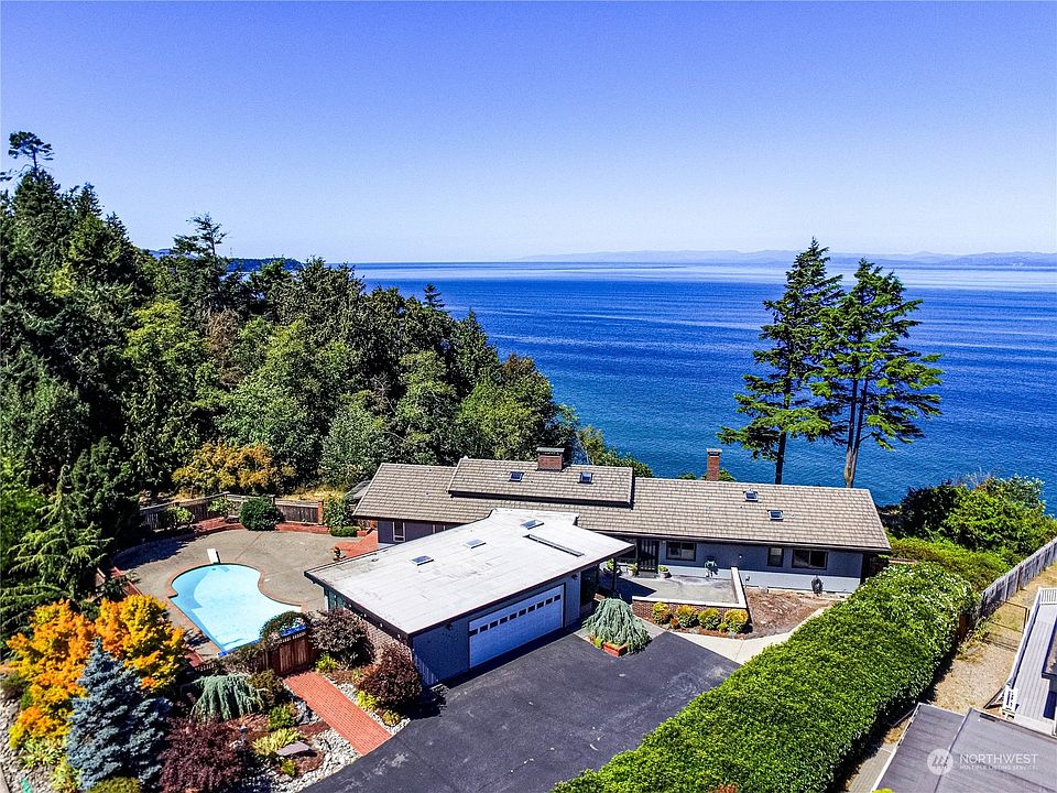 Watch eagles fly overhead & ships pass by in the Straits from this rare gem featuring 3BR 2.5BA+office & bonus spaces. Situated on high bluff on over half an acre in the City, you'll enjoy spectacular water & mountain views all the way to Canada. Mid-century architecture blends w/updates to make you never want to leave--fully fenced patio area w/outdoor heated pool & diving board, private hot tub area, asphalt driveway, oversized 2-car garage w/workshop, lifetime tile roof, front courtyard, massive deck & windows to showcase the views, floor to ceiling brick fireplace, totally remodeled kitchen w/solid wood cabinets, granite counters, JenAir appliances & walk-in pantry. Hardwood floors, built-in office desk & wet bar. Must see in person!