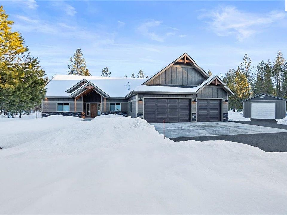 Stunning custom home situated on 4.47 treed acres in highly sought-after Lone Mountain Estates just 15 minutes north of Coeur d'Alene. This pristine home is located in the desirable Lakeland School District, boasts 2408 square feet, 3 bedrooms, 2.5 bathrooms,14 x 28 shop, 18 x 25 carport, open concept living room with vaulted tongue and groove ceiling, and a gas fireplace with masonry accents. The chef's kitchen offers a large island with bar seating and granite countertops, nice pantry, and upgraded stainless appliances. Large master suite offers private patio access, spacious master bathroom, dual vanity sinks, tiled walk-in shower, and a large oversized walk-in closet. Enjoy all the privacy while relaxing or entertaining from the extended covered patio with expansive park-like views.