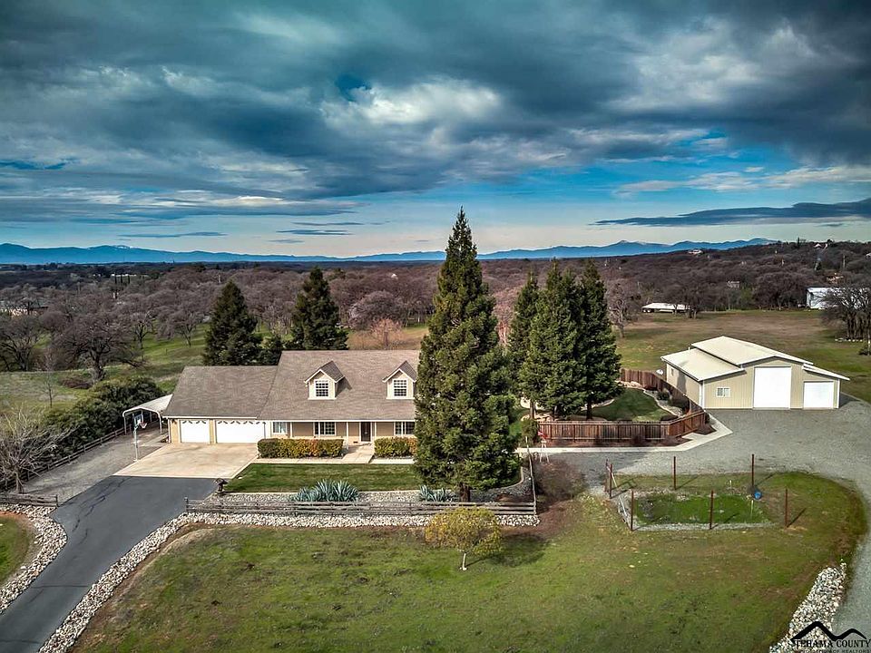CLASSIC TWO STORY COUNTRY FARM HOUSE on 3 usable acres in desirable NOBLE OAKS ESTATES. Over 2300 sq ft, 3 bedroom, 2.5 bath updated home featuring sunken Great room with natural gas fireplace, downstairs master suite, tasteful kitchen with granite and stainless appliances, over sized utility room and 1/2 bath. Staircase leads to two spacious bedrooms and guest bath. New carpet throughout. Exterior features include in ground, gunite swimming pool, putting green, fenced yard, picnic area, and established lush landscaping front and back. Additionally 44' X 48' insulated metal shop with concrete floor, bathroom and 2 automatic doors along with man door. Beautiful property and something for everyone!! Private roads and protective CC&R's.
