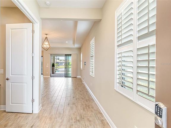 This coveted Sea Mist floor plan in Grand Palm by Neal Communities was built in 2021. Located near beautiful beaches, Wellen Park and Downtown Venice. The resort style community of Grand Palm offers walking trails, pools, pickleball, fitness center, tennis, dog park and activities director and more. As you enter this open and bright home you see 10 ' ceilings, plantation shutters,wood look tile floor and a sparkling pool & spa with view of the water through the double sliders. The large den makes a great home office or flex space. The great room has a tray ceiling, plenty of windows and is open to the kitchen and dining area. The gourmet kitchen offers a gas cook top w/ exterior vented hood, wall oven, upgraded cabinets, quartz and walk in pantry. Family and friends will gather around large kitchen island during get togethers. The powder bath for dinner guest is conveniently located while still private. The primary bedroom has a view of the pool, tray ceiling, walk-in closets, and double sinks in the primary bath. Guest bedrooms share a generous Jack & Jill bath with double sinks. The large laundry room has dedicated circuit for a 2nd refrigerator or freezer, washer and gas dryer provided. The 3 car garage w/epoxy floor paint keeps the floor clean and shiny. Impact windows, hurricane screens on the lanai and whole house surge protector provide convenience and security. Lanai is pre-plumbed w/ gas grill & sink for outdoor kitchen.