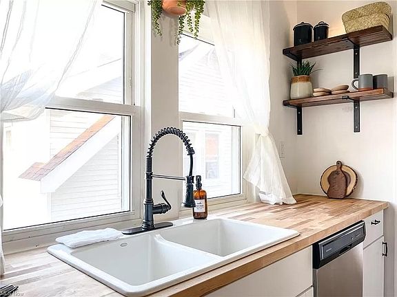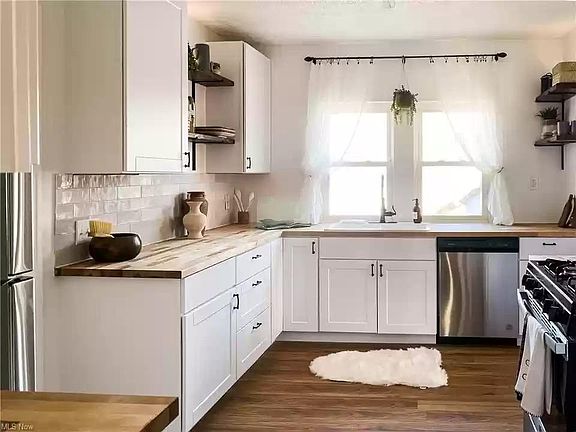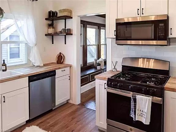 Updated Kitchen featuring butcher block countertops, new cabinets, new flooring. (everything is new)