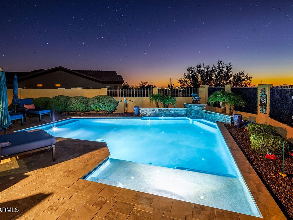 If you're looking for upscale, resort-style living then look no further! This beautifully upgraded, move-in ready home features 3 bedrooms, 2 bathrooms, a pool with water feature, city & mountain views and truly has it all! This stunning home is perfect as either a full-time residence or a lock-and-leave retreat. Step into luxury with high-end finishes and thoughtful details at every turn. The chef's kitchen is a showpiece featuring granite countertops, stainless steel appliances, staggered cabinetry, a custom tile backsplash, and a breakfast bar that opens to the spacious great room — perfect for entertaining. The home features oversized tile flooring throughout the main living areas and new plush carpet in the bedrooms, complemented by plantation shutters, crown molding, and designer light fixtures throughout. Both bathrooms have beautifully tiled shower surrounds that reflect quality craftsmanship. The backyard is an entertainer's dream, complete with a pool by California Pools, multiple seating areas, expansive travertine pavers, artificial turf, and an electric retractable awning. Enjoy mountain views from the front courtyard and breathtaking sunsets from your private, low-maintenance backyard oasis.
