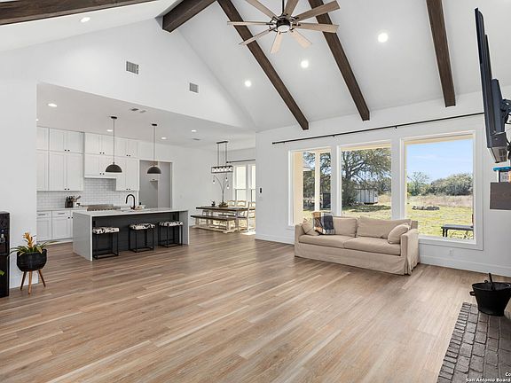 Welcome to the beautiful Texas Hill Country! This custom-built 5 bedroom, 3.5 bathroom home boasts high vaulted ceilings, an open floor concept, and modern finishes throughout. Step into the bright and spacious living room, complete with a cozy fireplace and large windows that flood the space with natural light. The kitchen features stainless steel appliances, granite countertops, a large island, and a big walk-in pantry. Enjoy the sunrise and sunset from the covered patio areas while the raintree sprinkler system keeps your landscape green. The gated community offers many amenities like, equestrian center, river park, pool, and a clubhouse. Dedicated work office and three secondary rooms makes this residence perfect for every walk of life. The fifth bedroom upstairs can be used as a guest suite or a secondary master bedroom. Schedule your private showing today!