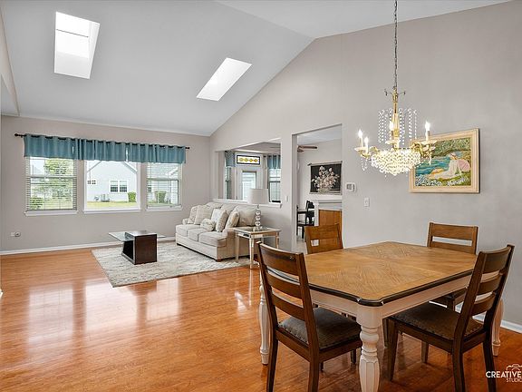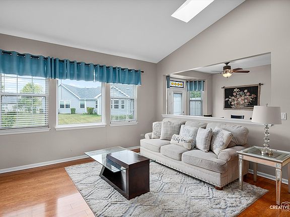 Welcome to this 2-bedroom, 2-bath ranch townhome in the sought-after 55+ community Carillon Lakes. Beautiful hardwood floors create a luxurious feel throughout the dining room, living room, and bedrooms. White trim and classic white 6-panel doors with brushed nickel lever handles add a fresh, modern touch throughout the home. The spacious living room features a vaulted ceiling, two skylights that fill the space with natural light, and views of open space. The open floor plan leads seamlessly into the kitchen with tile floors, stainless steel stove, dishwasher, refrigerator, microwave, an under-sink reverse osmosis system, and a cozy eating area with bay window. Step outside to enjoy the private patio with a privacy fence and peaceful views. The primary suite offers hardwood floors, a ceiling fan, walk-in closet, and a private bath with walk-in shower and grab bars. The second bedroom also features hardwood floors and a large bay window. This guarded, gated community offers resort-style living with a clubhouse, indoor and outdoor pools, fitness room, Pickle Ball, Bocce Ball, 3-hole golf course with putting green, ponds, fishing, and an auxiliary pool for visiting guests under 18. Major updates include: furnace & A/C (2019), water heater (2020), washer (2021), garage door opener (2022), reverse osmosis system (2022), roof (2024), and gutters (2024) garbage disposal (2025). Move-in ready and maintenance-free, this home combines comfort, convenience, and community.