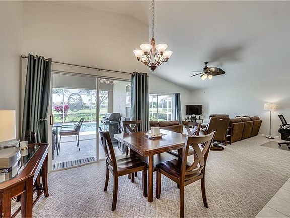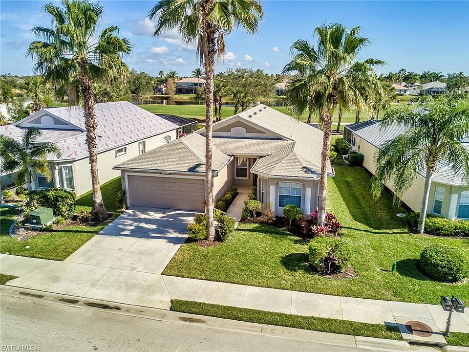 Turnkey furnished heated pool home with golf course and lake views! 3 bedrooms, 2 baths. Light and bright open great room floor plan, perfect for entertaining. Kitchen overlooks large family room and has plenty of cabinet space including additional cabinets and countertop in breakfast nook. Master bedroom has a slider that leads out to the lanai, large walk in closet and attached bath has dual sinks and separate tub & shower. Nice covered area on the rear lanai & beautiful views of the 3rd hole of the golf course. Pool heater, pool pump, hot water heater, dishwasher and electrical panel have recently been replaced! Accordian and roll down shutters on all openings! Stoneybrook amenities offer something for everyone! Exercise room, tennis courts, pickleball, volleyball, basketball, in-line skating rink, bocce ball and baseball field! The golf course is public so you can pay when you play. Conveniently located close to shopping, dining, interstate, beaches, university & airport. Short walk to golf course clubhouse, CVS, Publix, Miromar mall and Hertz arena. 15 minutes from airport baggage claim. Low association fees and great amenities make Stoneybrook a popular choice!