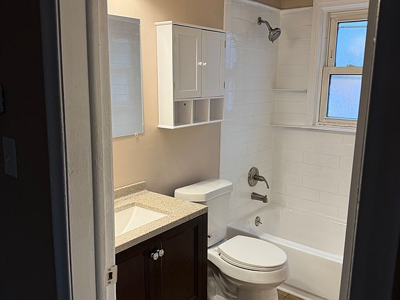Updated bathroom with new flooring, new toilet, new cabinet, and refinished tub