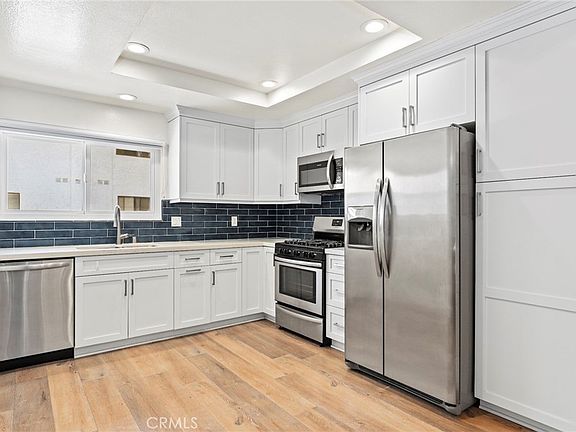 This light and bright split-level townhome offers stylish living in the heart of Woodland Hills. Featuring beautiful wood-like laminate flooring throughout, this home includes an updated kitchen with stainless steel appliances and updated bathrooms. The spacious primary suite boasts a large walk-in closet, private balcony, and a tastefully remodeled ensuite bathroom. The lower-level living room opens to an enclosed private patio through sliding glass doors, perfect for indoor-outdoor entertaining. The main level includes a bedroom and full bathroom, along with the kitchen and dining area. Additional highlights include direct-access two-car garage with laundry and access to community amenities such as a pool, spa, and tennis courts. Conveniently located across from the Rams practice field and within distance to Westfield Topanga Mall, the Topanga Social, The Village and Costco. This home combines comfort, convenience, and style in one unbeatable location.