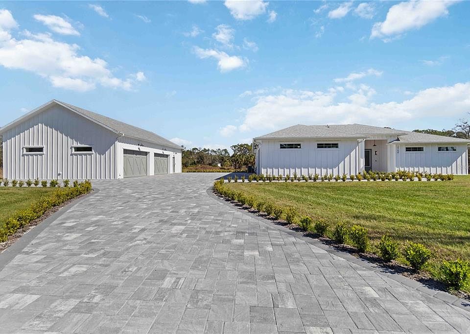 Dreaming of luxury, space, and privacy—all just minutes from the city? This one of a kind 2024 custom built farmhouse and guest house has a total of 4 bedrooms, 3 full bathrooms, 2 full size kitchens, XXL pool, and oversized 6 car garage meticulously designed for the most discerning tastes & over engineered with no expense spared. Custom interior features include: European white oak wire brushed wood floors, double stacked crown molding, full extension window & door casings, large baseboards, cypress tongue & groove walls & ceilings, 8’ solid core interior doors, knotty alder barn door doors, designer plumbing & light fixtures, walnut ceiling fans, level 5 drywall (silky smooth), fully dimmable lighting, quartzite countertops & backsplashes, knurled cabinet hardware, and soundproofing throughout. The gourmet kitchen features floor to ceiling cabinetry, white oak radius hood and island, cristallo quartzite countertops with full height backsplash, 2x convection ovens, 36” induction cooktop, 66” fridge/freezer column set, under-the-counter 30” microwave, pot filler, and ample storage. The secondary kitchen features floor to ceiling cabinetry, Taj Mahal quartzite countertops with full height backsplash, 36” built-in refrigerator, ice maker, 30” microwave, induction range with convection oven, and leathered marble floors. Spa-inspired bathrooms feature imported marble on the floors, walls, ceilings, wainscoting, floor to ceiling ½” thick shower glass with transom for steam showers, standalone soaking tub, and custom vanities. The laundry room features floor to ceiling cabinetry, 30” sink, ample storage, comfort height commercial washer & dryer, and quartzite countertop with full height backsplash. The bedrooms feature oak wood or marble flooring, cypress tongue & groove accent walls, and custom closet built-in. Exterior features include, resort-style lanai with cypress tongue & groove ceiling, marble deck, and 22’x35’ heated saltwater pool, 7’x35’ sundeck under a 30’x41’ panoramic pool cage. Every detail exudes relaxation and entertainment. Additional features include: detached guest house with private entrance and attached 4 car garage, 5,000 SqFt paver driveway/walkway/RV parking area with 50 amp receptacle, water & septic hook up, impact rated low-e insulated windows & doors, custom carriage house R-19 insulated garage doors, Kinetico commercial whole house RO system, spray foam insulation throughout, insulated interior walls, vertical board and batten on all exterior walls, 2x custom HVAC systems with whole house fresh air and dehumidification systems, 400 amp electrical service, solid poured concrete envelope with R-25 insulation on both sides, marine grade light fixtures, solid non-vented soffit, custom half round gutters, and cypress tongue & groove lanai & entry ceilings. Need storage for your toys? This property features a 19’x22’ garage with 10’ ceiling height and additional 28’x38’ garage with 21’ ceiling height, providing a total of 1,662 SqFt dedicated garage space. This property is not just a home—it’s a lifestyle. Come experience the peace, luxury, and space you’ve been dreaming of. Welcome to your own slice of Florida paradise!