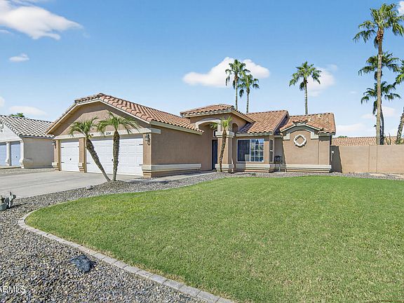 This entertainer's dream home has it all! Located in a cul-de-sac with 3 bedrooms and 2 baths, the open floor plan features a dramatic floor to ceiling fireplace with the TV included and a showstopping kitchen that has granite countertops, a full granite backsplash for easy cleaning, stunning cabinetry with endless storage, and a perfect flow that makes cooking and gathering effortless. There's no carpet anywhere, and the split primary suite offers privacy with dual sinks, granite counters, a soaking tub, walk in shower, and views of the sparkling blue pool. Step into your backyard paradise with a huge covered patio, outdoor kitchen, refinished pool in 2023, putting green, and a checkers board!