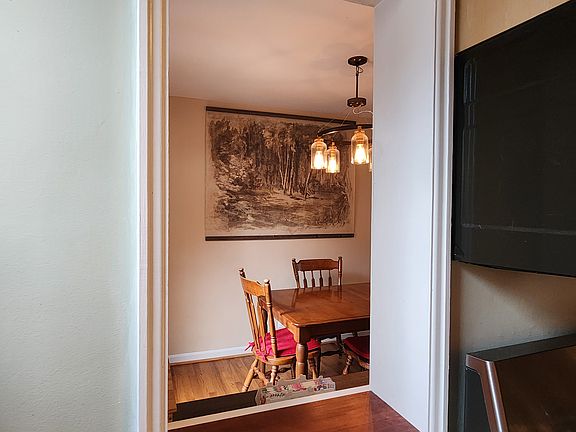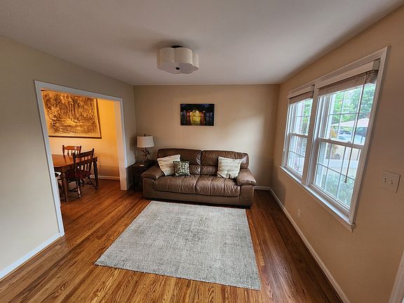 Hardwood floors extend throughout the home, and walls in neutral tones create a warm, versatile backdrop for any style of decor.The main level features a bright living room and dining area with large windows. The updated kitchen includes granite countertops, a stainless steel gas range and built-in microwave (both purchased in 2022), and ample cabinetry with additional shelving for storage.
