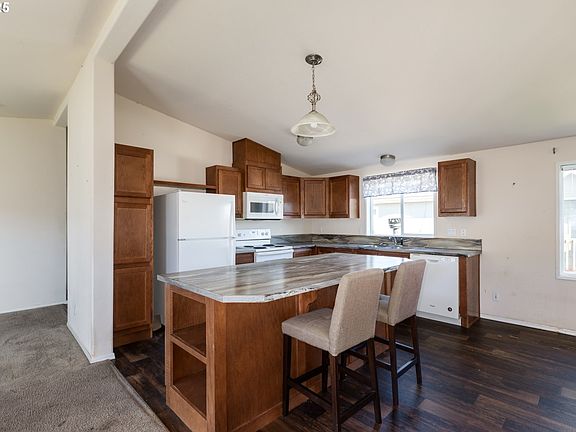 This home offers a great room feel with the open spaces, large dining room and island kitchen. You will enjoy making meals in this home with lots of good counter space and plenty of cabinets. Good sized rooms including a primary suite and primary bathroom. All appliances included! Fenced yard with tool shed too for all the extra storage. Offers subject to park application approval.