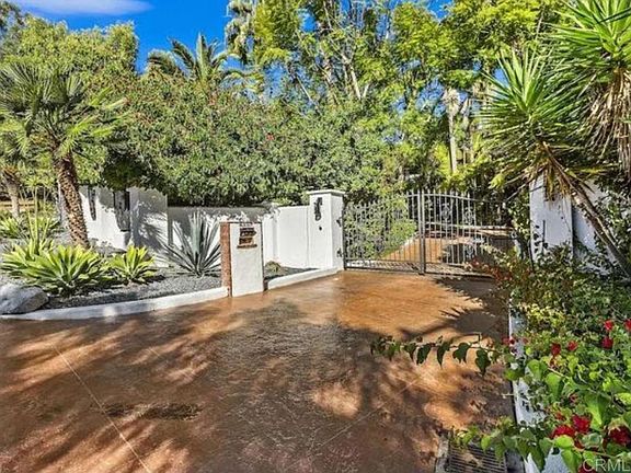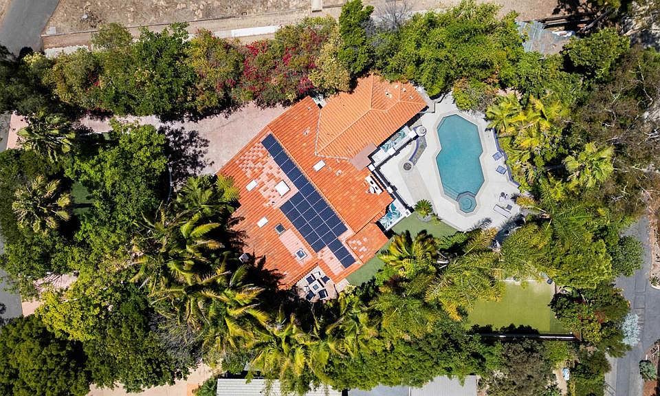 Welcome to your own tropical retreat, perfectly situated on over half an acre at the meeting point of Rancho Santa Fe, Encinitas, and Olivenhain. This gated estate offers the peace and privacy of a secluded getaway while keeping you close to upscale dining, boutique shopping, and the coast. Designed for effortless California living, every space has been created to blend comfort, functionality, and style. The expansive primary suite feels like a private resort with sweeping tree-lined views, a newly remodeled spa-inspired bathroom, and a spacious walk-in closet that connects directly to the upstairs laundry. Whether you want to unwind or work from home, a detached ADU office just steps away offers convenience without sacrificing connection. Outdoor living centers around the Pebble Tek pool and spa, which can be controlled from your phone. Host gatherings by the fire pit and outdoor dining area with built-in heat, or enjoy the multi-sport court for pickleball, golf, or soccer. The grounds have been redesigned with new concrete surfacing and lush, Spanish-inspired landscaping for beauty and ease of maintenance. Recent updates throughout the home include solar panels, a tankless water heater, EV charger, upgraded roof underlayment, fresh paint, an enhanced septic system, and a transformed theater with bar and LED fireplace. Smart home features add security and control at your fingertips. Every upgrade here brings comfort, efficiency, and peace of mind, giving you a lifestyle that’s both elevated and effortless. This home isn’t just a sanctuary, it’s a statement of living well.