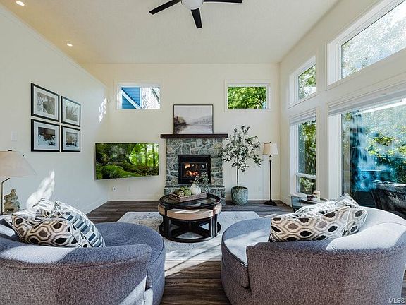 Cozy, charming and beautifully maintained, this 3 bed, 3 bath home offers 2,100sqft of comfortable living on a quiet no-through street in a welcoming family neighbourhood.The sunny west-facing backyard features mature, lush landscaping and a private 274 sqft patio—ideal for relaxing and BBQs.The open-concept layout includes vaulted ceilings, large windows, a gas fireplace, a main floor bedroom with full bath, laundry and kitchen closet pantry.Upstairs are two spacious bedrooms and two more bathrooms.Updates include appliances, granite countertops, hot water on demand, heat pump, blinds, fresh paint inside and out, artificial turf, and more. Enjoy a triple driveway, double garage with storage and EV charger, and full crawlspace for additional storage.Steps to parks, minutes to schools, shopping and amenities with Bear Mountain Resort - golf, spa, dining, tennis and fitness just a quick drive up the mountain. A warm, welcoming home ready for new memories to be made!