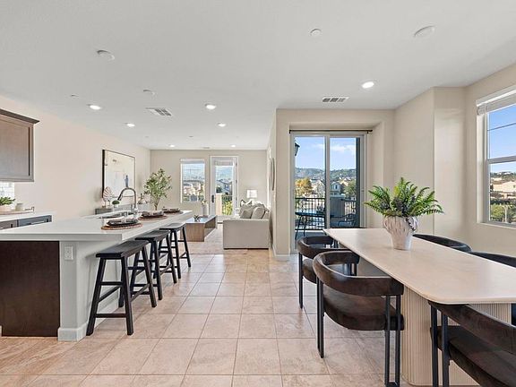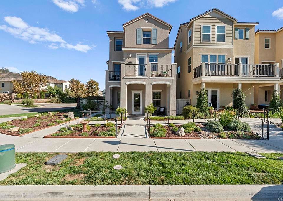Located in the desirable Martingale neighborhood of Harmony Grove Village, this stunning three-story live/work home offers modern design, flexible workspace, and sweeping Ridgeline mountain views. Built in 2020, this home offers 3 bedrooms, 3.5 bathrooms, live/work space, and 2,204 sq ft of thoughtfully designed living space. The property features an open-concept floor plan, upgraded finishes, solar, tankless water heater, new carpet, and two second-level balconies with ridge line mountain views. The first level includes a builder designed live/work/play flexible area with private entry, private full bathroom, recessed lighting, and multiple windows that create a bright, inviting atmosphere. This space is separated from the main living areas while staying conveniently connected under one roof. The full bathroom is thoughtfully designed with accessibility in mind, featuring tile flooring that flows seamlessly into the step-less shower. The shower is equipped with convenient handrails and a retractable seat for comfort and ease of use. Additionally, supportive grab bars are positioned throughout the room, ensuring safety and confidence. The main living area showcases an open floor plan that seamlessly connects the kitchen, dining, and family spaces. The gourmet kitchen features quartz countertops, a center island with bar seating, stainless steel appliances, dark wood cabinetry, and a full tile backsplash. The adjoining dining and living areas are highlighted by large windows, doors leading to the balcony, and tile flooring throughout. The second level primary suite includes recessed lighting, a walk-in closet, and a spacious ensuite bathroom with dual sinks, a quartz vanity, and a glass-enclosed shower with bench seating. Two additional bedrooms and a full bathroom are on the third level, providing privacy and flexibility for family, guests, or a home office. The laundry room is conveniently located on the second level and includes upper cabinetry for additional storage and a window for natural light. The balcony off the main living area extends the indoor space and offers beautiful mountain and neighborhood views. The low-maintenance front patio provides an additional private outdoor area. Harmony Grove Village is a master planned community with gorgeous mountain ridgeline views, multipurpose trails, gated pool for homeowners, dog and equestrian park, multiple private parks and the huge 4th of July Park (open to the public). The Grove is the perfect place to enjoy the outdoors- it includes the pool, jacuzzi, wading pool, barbeques, shaded tables, play structure and a covered lounge area with outdoor furniture and fireplace.