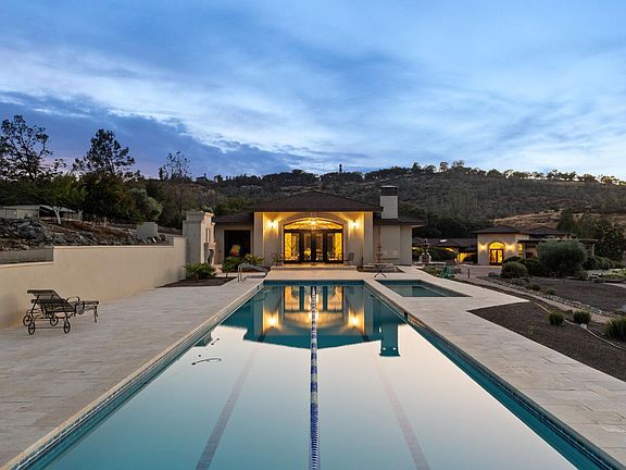 Set on 48 gated acres in the heart of El Dorado Hills, 2155 Salmon Valley is a private luxury estate offering over 11,000 conditioned sq ft, including an 9,800 sq ft residence and a 2,200 sq ft pool house/rec center built in 2024. Designed for multigenerational living, the home blends timeless elegance with resort-style amenities. The main residence features vaulted cherrywood ceilings, sculpted imported doors, hydronic heated floors, and a 2,300-bottle climate-controlled wine cellar. The primary suite includes dual walk-in closets, spa bath with soaking tub, steam shower, dry sauna, and private fitness space. The rec center highlights a lap pool, locker rooms, and commercial-grade kitchen with entertainment space wrapped in stone. Outdoors, enjoy multiple fountains, a spring-fed pond with bass and bluegill, planted gardens, and a commercial greenhouse. Complete with a private runway, hangar, and helipad, plus expansive storage for RVs and boats, the estate is secured by sustainable features including a 35KW solar array with 10 Tesla batteries, metal roofing, and walk-in refrigeration. A rare opportunity for ultimate privacy, self-sufficiency, and sophistication.