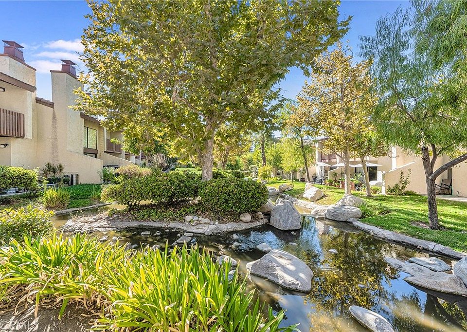 This is the one you’ve been waiting for! Relax on your private back patio while listening to the soothing sound of water flowing through the creek, surrounded by trees and lush grassy areas. This beautifully maintained home features a spacious open floor plan with an updated kitchen, complete with stainless steel appliances, and seamlessly connects to the dining and living areas—perfect for entertaining. Cozy up by the fireplace while enjoying serene views of the water just outside your windows. Downstairs boasts brand-new vinyl flooring and a convenient powder room. Upstairs, you'll find three well-sized bedrooms and two full bathrooms. The large primary suite offers soaring ceilings, a generous walk-in closet, an en suite bath, and a private balcony with tranquil views of the creek, trees, and greenbelt. The additional two bedrooms share a full bath with an updated vanity and a combined shower/tub. A dedicated laundry area with washer and dryer is conveniently located upstairs. The home also includes a private two-car garage. Set within a beautifully landscaped community featuring meandering creeks, two tennis courts, and a resort-style pool and spa area. All of this is ideally located near Warner Center, The Village, Westfield Topanga Mall, and just steps from a vibrant park with summer concerts. Enjoy easy access to incredible restaurants, shopping, and entertainment! Don’t miss this rare opportunity to own a peaceful retreat in the heart of it all!