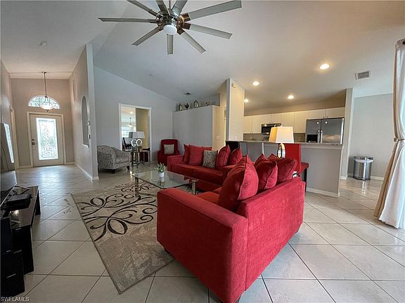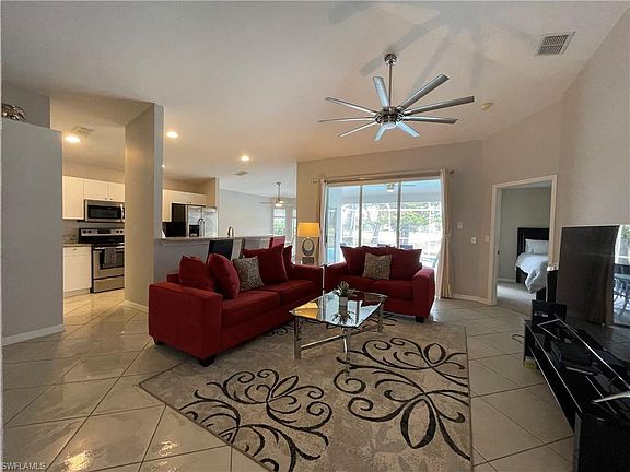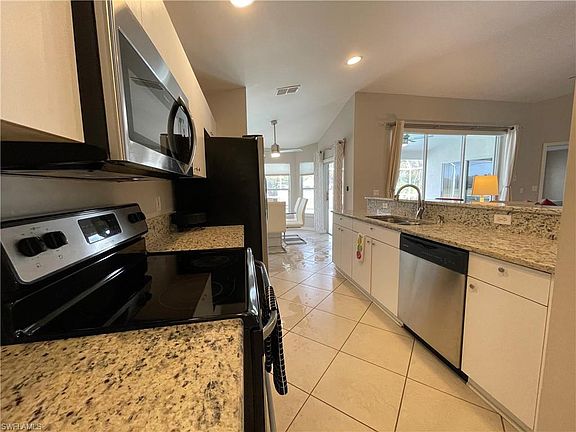 Must see this 2+ Den furnished pool home with golf course views in the highly sought after community of Stoneybrook! The kitchen and living room boast an open concept with vaulted ceilings and tons of natural light. The owner's suite offers a walk in closet and access to the pool area. The second bedroom and bathroom have a pocket door to make a second ensuite. The den is currently being used as a third bedroom. Tile on the diagonal throughout main living area and carpet in the bedrooms and den. Stoneybrook golf course is a public course and is play as you pay. Golf cart friendly community to take the cart for a quick stroll to Duffy's to grab lunch or dinner. Gatehouse is attended 24/7. HOA dues are low but includes so much! There are multiple community pools, walking paths, tennis courts, an exercise facility, pickleball, basketball and volleyball courts, bocce ball, baseball field and even an in line skating rink. Right across the street from Miromar Outlets, Hertz Arena, I-75, close to the beaches, restaurants and so much more!