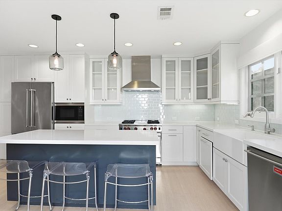 This home is filled with natural light throughout and high quality new finishes. The sun filled Primary suite has a remodeled full bath and separate shower. The large living room has arched entryways leading down the hall to a wide-open concept beautifully remodeled Chef's kitchen and a dining room highlighted by original custom built-ins. French doors off the dining room open to your own oasis: Gazebo, built-in fire pit lounge and soothing waterfall surrounded by tall bamboo and a fully mature eucalyptus tree.
