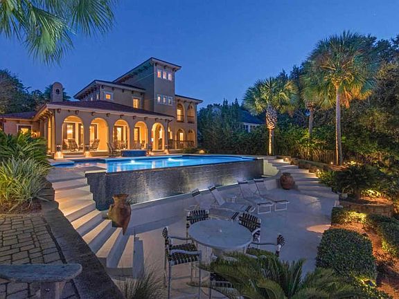 This magnificent private waterfront estate resides on Pensacola Bay, in Gulf Breeze. This home offers infinite sunset views, ample entertaining space, and a gated entry. You'll enjoy multi-tiered levels of outdoor living space, infinity pool, full outdoor kitchen, two separate fire pits (gas & wood burning), and a secret place to watch the sunset over the Bay. This home is built on a bluff with 24 feet of elevation and steel frame construction with no expense spared. You'll note the Mediterranean design influence, the hand crafted iron gates and Mahogany doors throughout the home, imported from Brazil. The Chef's kitchen comes equipped with Viking Professional appliances, 6 burner gas hood range stove with warmer lamps, butlers pantry, additional walk-in pantry and 2 trash compactors. The built-in breakfast bar looks onto the living area which has a formal dining room, pool table room, and wet bar equipped with a wine fridge and ice maker. Also off the kitchen you will find a wine tasting room with ample wine storage. The Master suite has bay views, an office with his-and-hers separate bathrooms and a 9??? thick 5000 psi concrete wall safe room. On the main floor you'll also find an In-Law suite with a private entrance, kitchenette and built-in bunk beds. The second floor hosts 2 additional bedrooms each with en-suite bathrooms and 2 secret game rooms. The oversized 3 car garage has a workshop, separate golf cart parking and a climate controlled storage area. Installed by All Pro Sound, the home automation system features 7 Elan touch screens to monitor security and multimedia as well as 11 TV???s, 61 interior speakers and 18 exterior speakers. The dock is equipped with a boat lift, 2 jet ski lifts, Trex decking and a flow-thru launching/swimming platform. Other notables are whole house generator, geothermal heating & cooling, spray foam insulation, exterior gas lanterns, newly repainted inside & out, all iron gates recently refinished and beautiful landscape lighting.
