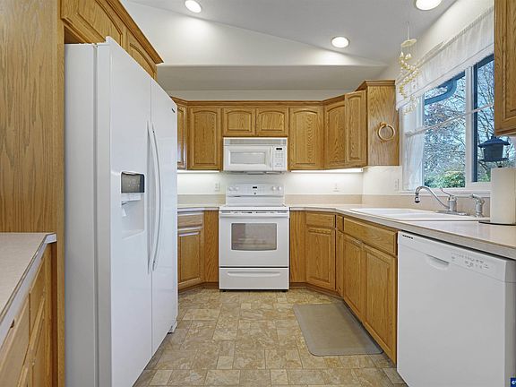 Welcome to this gorgeous home nestled on a peaceful cul-de-sac! The open-concept design is complemented by beautiful flooring throughout the main level. The living room has a gas fireplace, vaulted ceiling, and skylight, creating a warm and inviting space. An adjacent dining area with a skylight and sliders offers easy access to the private backyard. The kitchen features lots of cupboard space, an eat bar, and everything you need to entertain or cook with ease.