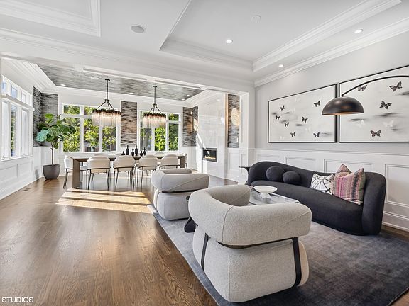 This exquisitely designed and impeccably maintained single family home is situated on a corner lot in Roscoe Village. With unobstructed south, west, and east exposures and soaring ceiling heights, each level of this home enjoys an abundance of natural light. The living and dining rooms feature custom millwork, a fireplace with floor-to-ceiling marble surround, along with south and west-facing windows showcasing tree-lined street views. A powder room is conveniently located between the living area and the kitchen. The kitchen features custom cabinetry, a large center island with built-in table, Wolf, Miele, and Sub-Zero appliances (including two) dishwashers and a built-in coffee machine, two sinks, and ample counter space. The kitchen opens to a family room with fire place, built-ins, and access to the back patio, roof top deck, and 2-car garage. Upstairs on the second level, you will find a luxurious primary suite with custom built-ins, millwork, windows with northeast exposure, and two walk-in closets. The spa-like ensuite bath has a steam shower, separate air jet tub, dual vanities, heated floors, and a private commode. Two graciously sized bedrooms with ensuite baths and heated flooring and a laundry room are located on the second level. The third level provides access to a rooftop deck with pergola, lighting system, and built-in fire pit. The lower-level has high ceilings, enjoys natural light, and features a large recreation room complete with a fireplace and a wet bar, 2 bedrooms, and 1.5 baths. Ideally located in the heart of Roscoe Village near Hamlin Park, Amundsen Elementary School, restaurants, shopping, and public transportation, this is the perfect home!