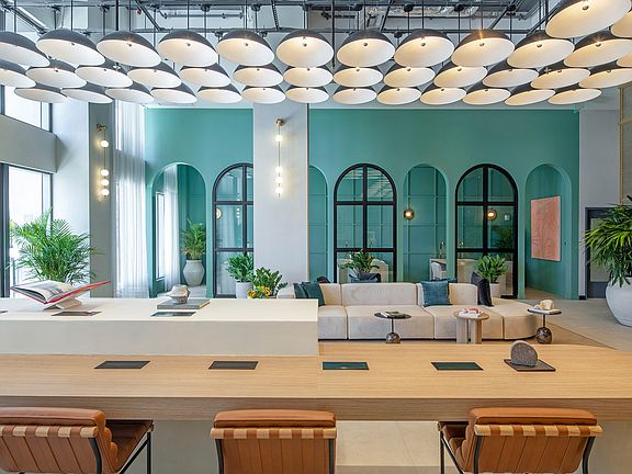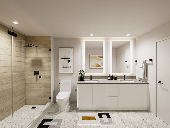 The apartments showcase a contemporary design highlighted by floor-to-ceiling windows, luxury tile flooring, and soaring vaulted ceilings that enhance the sense of space and light. Each residence features premium finishes, including imported Italian cabinetry, natural quartz countertops, high-end Samsung appliances, and in-unit full-size washers and dryers. Residents can enjoy spacious walk-in closets, stylish bathrooms with illuminated mirrors and modern vanities, and smart home conveniences such as keyless entry and app-controlled thermostats. Select units also include private balconies, offering an inviting extension of the living space outdoors.