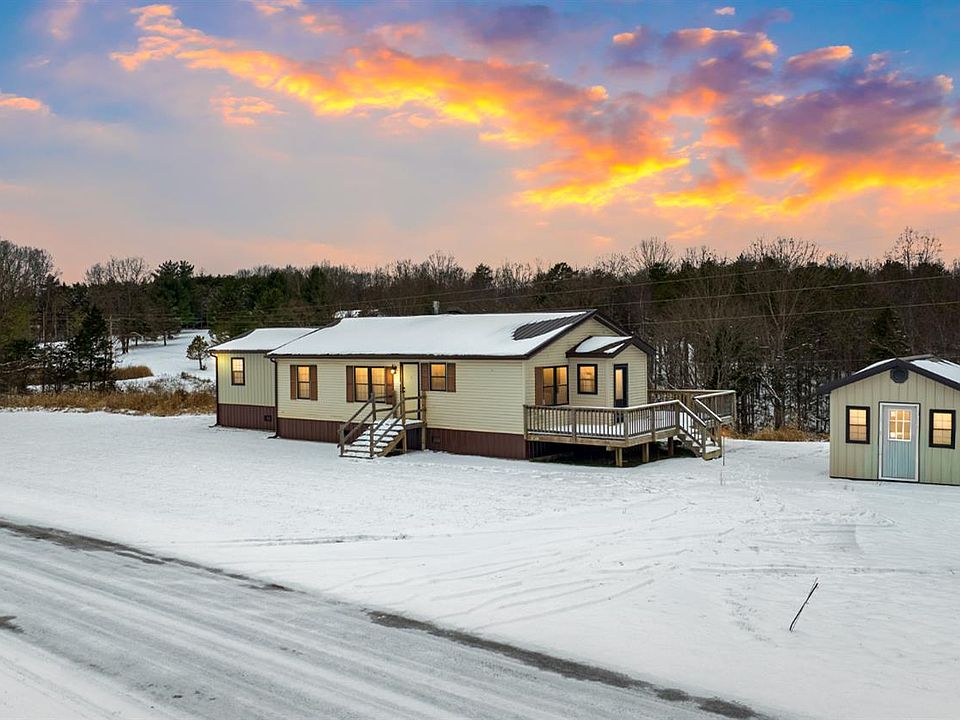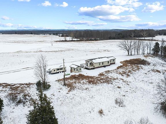 Experience the perfect blend of modern luxury and serene rural living in this 2-bedroom home situated on 3 private acres. Overlooking picturesque fields, this property offers a peaceful retreat with high-end finishes throughout. The interior features beautiful hardwood floors and high-quality, handcrafted Amish-made cabinetry that provides both elegance and ample storage. The primary bathroom is a true sanctuary, recently remodeled to include heated floors, modern fixtures, and a custom tile shower with dual heads. A second full bathroom is equally impressive, offering a large double vanity with additional Amish-made cabinets and a spacious walk-in tile shower. The charm extends to the outdoors, where you can enjoy panoramic views from the deck or take advantage of the expansive front yard. The 3-acre lot provides plenty of room to breathe and includes a functional storage shed. Additionally, the property is equipped with an extra outdoor electric hookup. This is a must see rare find!