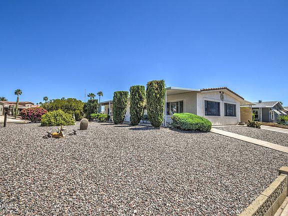 WOW maybe this is the lot you have been waiting for at 8,173 square feet. This home has two bedrooms and two bathrooms. It has a great open floor plan with formal dining room, living room and family room. This is an all electric home. The laundry room has lots of wall cabinets with a built in desk. The kitchen is large enough to eat your meals there. There is a very nice work shop / golf cart garage. The yard has a low wall around the entire property. Apache Wells is a 55 plus community with many varied activities for everyone.