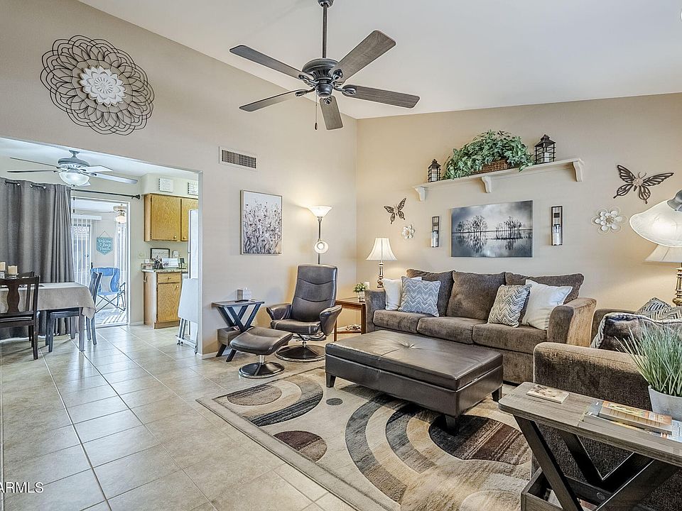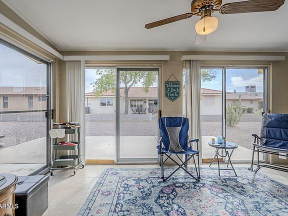 This home offers the ultimate lock-and-leave, low-maintenance lifestyle—ideal for winter visitors or full-time residents alike. It has been meticulously cared for, with major updates that include a roof replacement in 2019, a full AC system replacement in 2022, a new water heater in 2023, and interior repainting along with the removal of popcorn ceilings. These are just a few of the many thoughtful improvements made throughout the home. Inside, you'll appreciate the vaulted ceilings in the living room, which features a bright west-facing window that fills the space with natural light. The cozy dining area sits just off the kitchen and flows seamlessly into the living space, creating a comfortable layout for everyday living or entertaining. The split-bedroom floorplan offers privacy, making it ideal for hosting guests. The spacious primary suite includes its own private bathroom and a walk-in closet, while the guest bedroom is conveniently located near the second full bathroom. The interior laundry room adds function and includes pantry-style shelving for added organization and storage. The east-facing backyard patio soaks up the morning sun and offers a peaceful retreat in the afternoons. The double garage includes built-in cabinets, a storage closet, and overhead storageperfect for tools, totes, and more. Located in Sunland Village East, one of the East Valley's most desirable 55+ communities, you'll have access to top-tier amenities: golf, pickleball, tennis, bocce ball, shuffleboard, pools, clubs, fitness center, and a vibrant social calendar.
