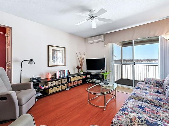 WATER FRONT spacious 2 bedroom condo ideal for first time homebuyers, down-sizers and investors! Pride of ownership prevails. Bright updated kitchen w/large window, tons of cabinets and counter space + island w/pot drawers. Main living area features laminate floors throughout the living room, dining and bedrooms. Primary room includes cheater door to large updated full bathroom w/tiled floor. Enjoy the picturesque river views and evening sunsets from the privacy of your balcony just off the living room. Two parking spaces included. A must see! 24 Hour Irrevocable on all offers.
