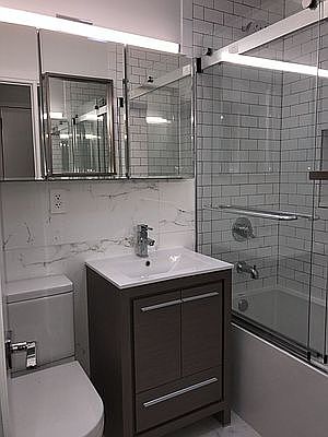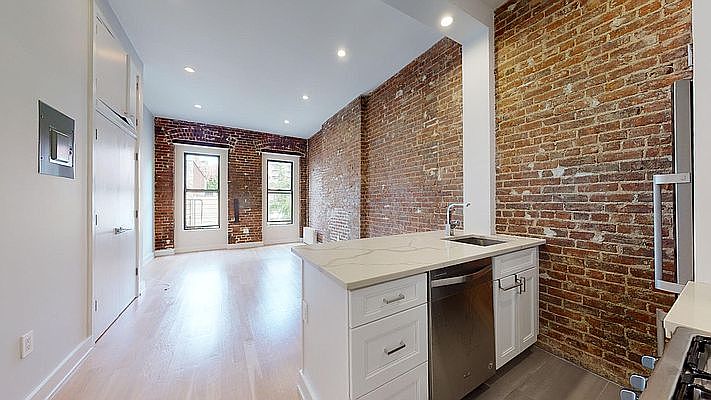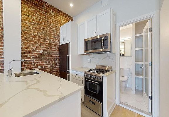 This charming prewar studio has a thoroughly modern kitchen and bath featuring stainless steel appliances, marble tile and polished chrome accents throughout. Exposed brick and high ceilings add to the great old New York character. There's a comfortable breakfast bar and a wall of atelier windows facing 84th Street. Good cabinet storage and closet space. The bathroom has a glass shower with subway tile walls. Pix are from a model unit in the same building. Finishes are accurate, more photos are coming soon.