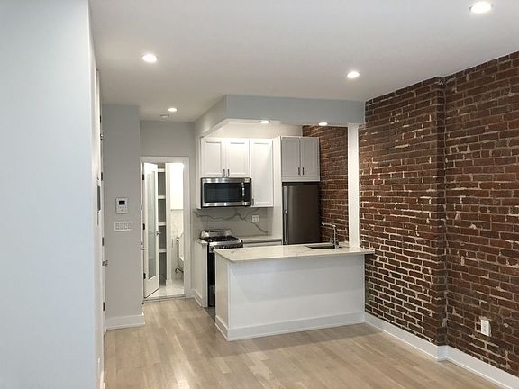 Renovated and bright studio featuring large living space, updated kitchen with stainless steel appliances, dishwasher, large granite island with a breakfast bar, modern marble bathroom, high ceilings, hardwood floors.