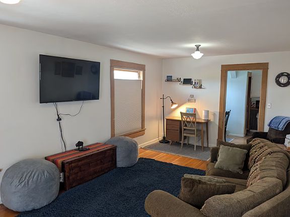 Directly downtown, a 2-bed 1-bath 1915 railroad house with all its historic charm is available October 15th for a 6-month lease. Fully furnished with everything you need, just bring your suitcases and enjoy. This home features a gas stove, a large fridge, a microwave, and a laundry area with a washer and dryer. The Jack and Jill bathroom has its original clawfoot tub/shower. One bedroom has a queen bed, and the other bedroom has a full-sized bed. Fully fenced shared backyard with a BBQ. High-speed Wifi included. Tenants pay all utilities. No smoking, no private parking, and no pets.