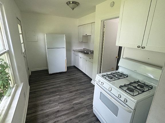 The kitchen comes equipped with plenty of cabinet space, a practical countertop layout, and room for essential appliances, making meal preparation both convenient and enjoyable. Hardwood-style flooring throughout the main living areas adds a warm, polished look, while neutral tones in the decor create an airy and flexible environment to match any style.
