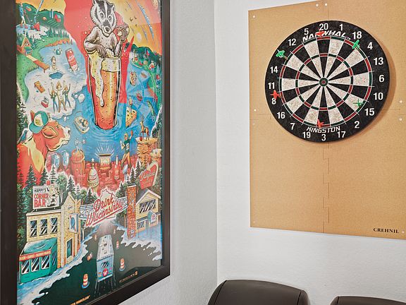 Upon entering, you'll be greeted with a warm & inviting gathering room w/ a 58" TV, mid-century modern furniture, and board games