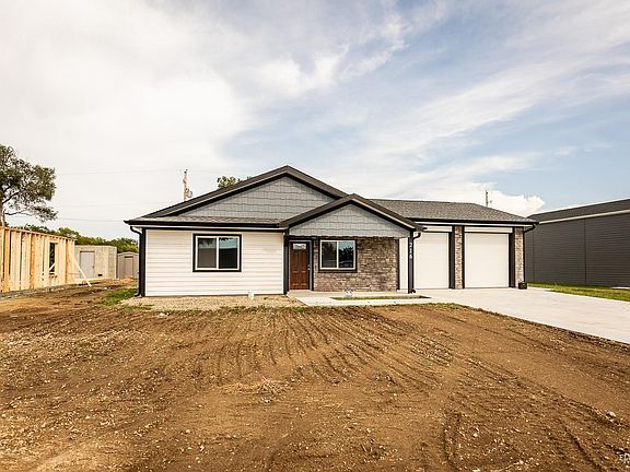 Don't miss your chance to own a brand-new home near Milford Lake, the largest lake in Kansas! This zero-entry ranch offers over 1,500 sq ft of living space with 3 bedrooms and 2 bathrooms. The interior features warm wooden beam accents and a spacious open kitchen, while the exterior boasts attractive stone detailing and a poured driveway. A 700 sq ft attached garage provides plenty of room for vehicles, a boat, or workshop space. The level yard offers potential for an additional outbuilding, and both a covered porch and patio provide inviting spots to relax outdoors. This new construction near Milford Lake is ready to become your dream home!