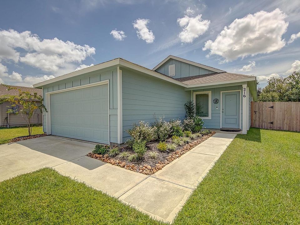 Welcome to 216 Houston Ave-your move in ready style home in Angleton. This beautifully maintained 2024 build boasts 3 bedrooms, 2 full baths across 1421 sq ft of open concept living. The thoughtful split-bedroom layout ensures privacy, while the heart of is its stylish kitchen-featuring a gas stove, abundant counter space, and seamless flow to the living and dining areas, ideal for both everyday life and entertaining. Outside you will find a generous, fully fenced backyard on over 8000 sq ft of land-a perfect canvas for outdoor enjoyment or future landscaping dreams. Located in the desirable Live Oak Ranch neighborhood, this house gives you the perks of new construction-modern finishes, energy efficiency, tasteful design-without any builder delays or oversight. Nestled in a peaceful, family-friendly community yet close to schools, parks, and local amenities. Its equally perfect for those seeking effortless, low hassle. Move right in and enjoy the best of Angleton living.