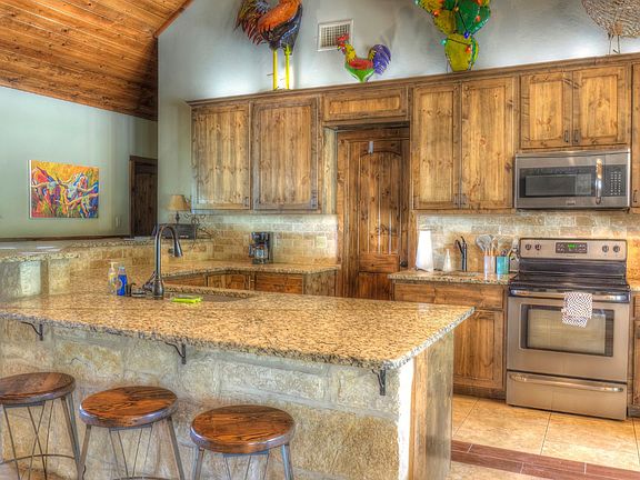 Here is your chance to own the highest-grossing vacation home in the Frio Pecan Farm! This short-term rental property is top-notch, and with an impressive established income history of more than $100,000 annually*, it's a perfect opportunity for the investment buyer who is also interested in personally enjoying the home from time to time. It's easy to see why this property is so popular, as the 2,864 sq.ft. home (per RCAD) features a rental-friendly floorplan; with the Master bedroom and each of the 4 guest bedrooms each having a private ensuite bath, while a more centrally-located half-bath is positioned off the Great Room, and an additional half bath is situated off the exterior back patio for pool-going guests. The open Kitchen/Dining/Great room is the perfect place for guests to gather indoors, with a floor-to-ceiling rock fireplace and vaulted wood ceilings with coordinating wainscoting interior walls for a luxe and durable finish. The kitchen consists of a breakfast bar with attached island, granite counters, stainless appliances, secondary vegetable sink, abundant knotty-alder cabinets, and a walk-in pantry for additional storage. The laundry room with full-sized washer and dryer is an added convenience for long-term visitors. The luxury Master Suite features vaulted ceilings, a walk-in closet, kitchenette/wet bar, French doors leading to the back patio/pool area, and private entrance through the garage. The lavish amenities continue exterior of the home with an outdoor kitchen and grill, over-sized covered porch, rock firepit patio, and inground pool with Baja shelf perfect for lounging. Owners and their guests enjoy private Frio River access and this home is being sold fully furnished. Call to schedule your private tour today and you will see why this extraordinary home is aptly name "The BIG House!!"