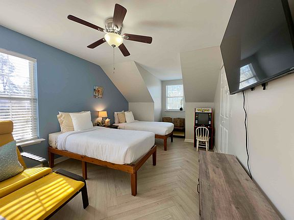 The upstairs suite features two twin beds, a private full bath, wall-mounted 50" Smart TV, nightstand, and reading chair ($1,200/mo, $1,200 deposit).
