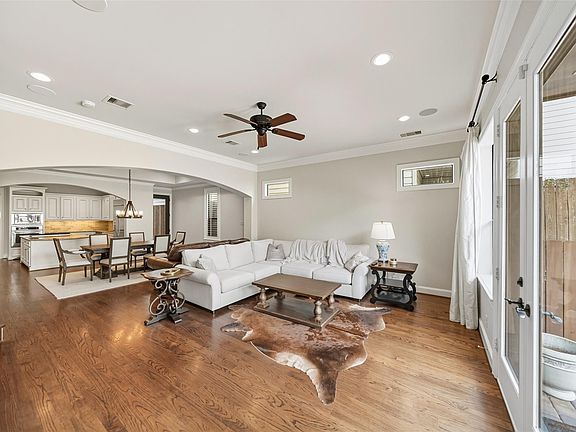 Welcoming free standing home with a private driveway, backyard and steps to Memorial Park. First floor living for your enjoyment & convenience. Hardwood floors throughout. Spacious living room with gas fireplace, built-ins, tall ceiling & french doors opening to the backyard. Your dining room is open to the living room & island kitchen for easy entertaining. Island kitchen has stainless steel KitchenAide appliances, wine cooler, granite counters & pantry, the natural gathering spot. First floor powder room. Step into the large 28 ft by 24 backyard with recent landscaping & patio. Primary suite with tray ceiling & french doors open onto a balcony overlooking the backyard! Primary bath with light colored travertine & granite counters opens into the spacious closet with access to the laundry room. Gameroom on the third floor. Three additional bedrooms with one ready for your office with a wall of built-ins & desk. Plantation Shutters. Stamped concrete driveway. Garage is 21'7 ft x 18!