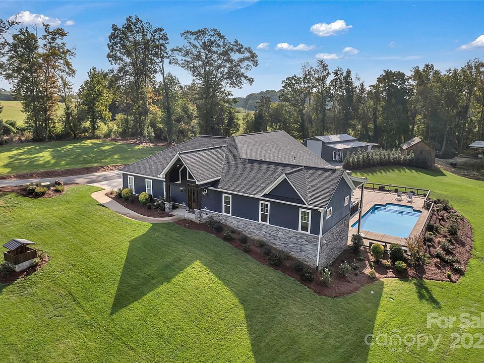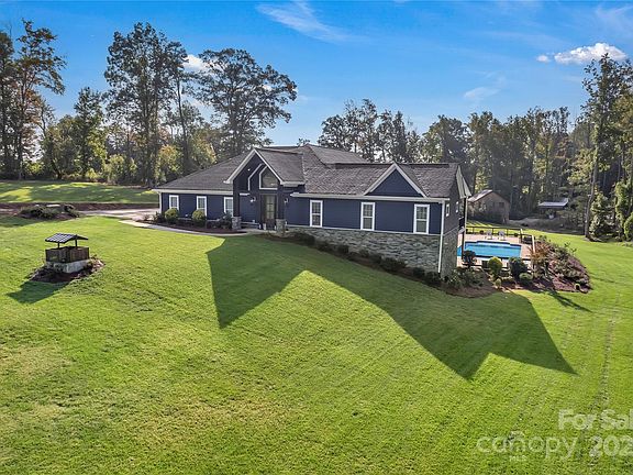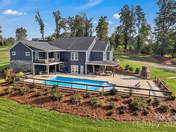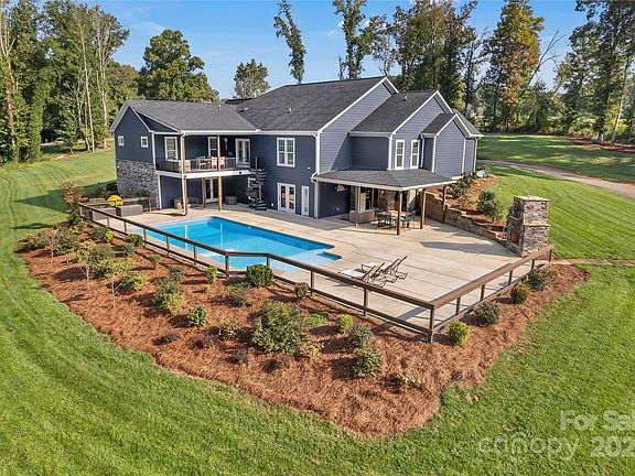 Luxury living awaits in this 4,630 sq ft estate on 5.84 acres in Stanley, NC! Step inside to gorgeous wood accents, LVP flooring, and a show-stopping kitchen with gas range, drawer microwave, dishwasher, and a massive island with seating. The main level boasts 3 bedrooms, including an owner’s suite with dual vanities, soaking tub, tile shower, and walk-in closet. Each guest ensuite offers its own tile shower. A stone-surround electric fireplace with built-ins anchors the living room, while the covered side deck with spiral stairs overlooks the pool. Main level also includes a large pantry, laundry, half bath, and oversized 3-car garage.