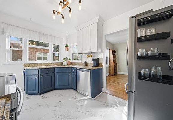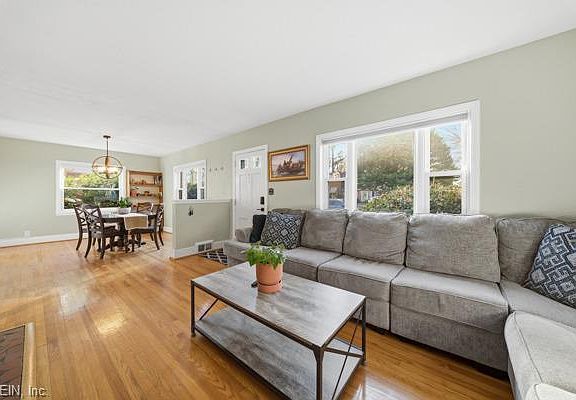 Beautifully maintained 5 bedroom, 2 bath Cape Cod with first floor bedroom & bath! Remodeled kitchen with newer cabinets, granite, & stainless appliances. Lovely hardwood floors throughout first floor, nice layout, & cozy fireplace! Three bedrooms downstairs & two bedrooms upstairs along with full bath. Upgrades include newer 30 year roof, HVAC & 2nd floor mini splits, ceiling fans, bathroom vanities, fixtures, & paint. Large fenced backyard is great for relaxing & entertaining! Centrally located near shopping, dining, and Naval Station Norfolk.