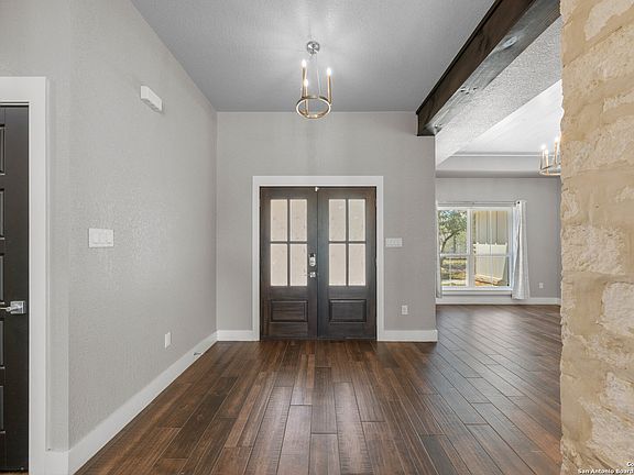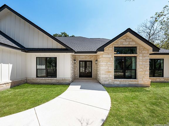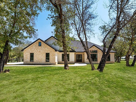 Absolutely Gorgeous Single-Story Retreat nestled under a beautiful canopy of Oak Trees!--With Stunning Back Yard Views, This meticulously maintained 4/3 blends a bit of elegance with modern comfort--Some of the main Features include Rich wood-like, hand scraped ceramic tile throughout, Quartz countertops, custom cabinets, large central island with breakfast bar that blends into the living area--The open concept combines all of this with the Two eating areas that all flow into the living area--The primary suite offers plenty of space and a soaking tub, separate shower, dual vanities along with a spacious walk-in closet--Opposite side of home offers what can be utilized as a secondary primary suite--The 18x10 back patio offers wonderful serenity with the green belt behind the 1 acre property--The 24x24 shop/garage offers that extra storage or that place for those projects workers--Exterior photos reflect what the yard could be like--Easy access back to 181, Floresville, and quick commute to San Antonio