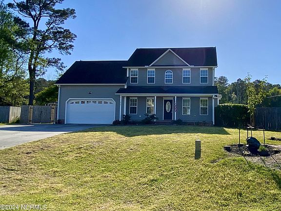 Located in the Waters Edge Subdivision, with no HOA and No City Taxes. This 3 bedroom plus bonus room, 2 ½ bath home sits at the end of the cul-de-sac on a 0.41 acre lot that is just one mile from a public boat ramp, offering easy access to endless outdoor adventures. This colonial style home includes a large covered front porch just waiting for your rocking chairs! As you enter the home you'll appreciate fresh paint, LVP and tile flooring throughout; no carpeting here! The family room includes a propane fireplace, perfect for those chilly fall and winter evenings. The backyard is fenced in and has a covered patio. The kitchen includes a breakfast nook, island and plenty of counterspace! Off the kitchen is the formal dining area, perfect for those holiday get-togethers. A hall off the kitchen includes the laundry closet and convenient access to your 2 car garage, making unloading groceries a breeze! . Head upstairs to your primary suite located on the right of the home which includes an ensuite with dual vanity. The 2 other bedrooms and bath are located at the other side of the home next to the HUGE Bonus Room! Home is convenient to Camp Lejeune back gate on 172, shopping, schools, and water access.. Call today to secure your personal tour! Home is in Foreclosure Hearing Phase and is being sold ''as is''