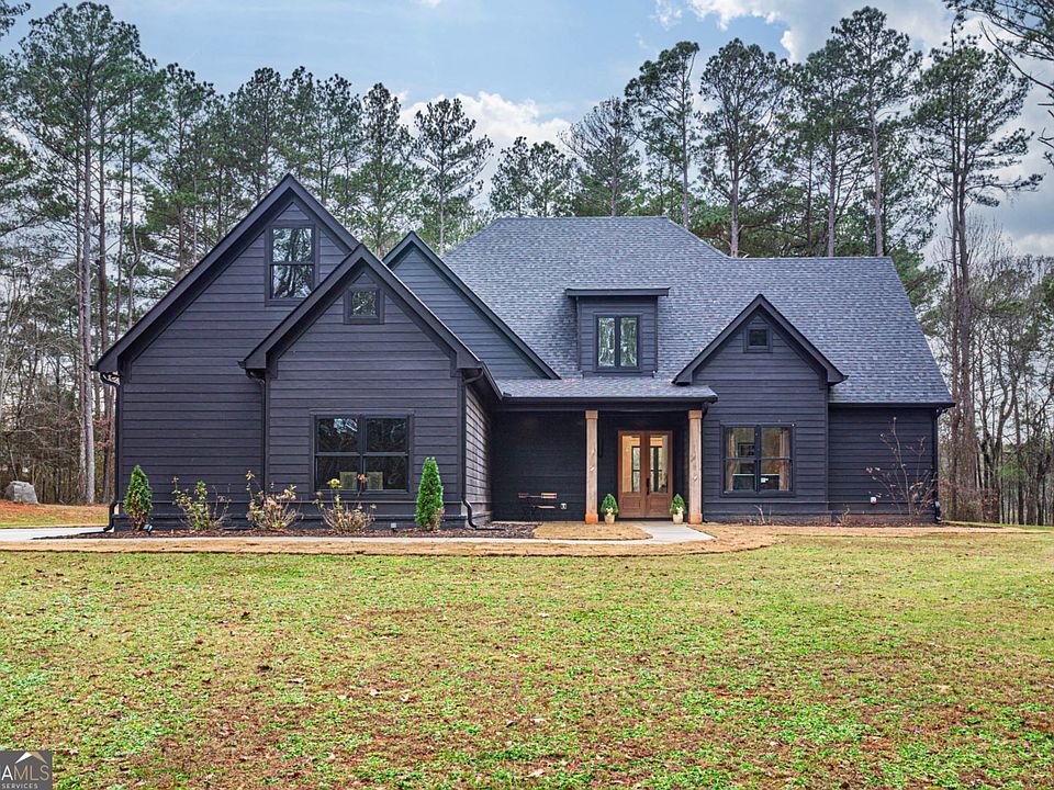 Welcome to this stunning modern farmhouse on nearly 6 private acres in a gated community-where timeless design meets contemporary luxury. This custom-built home offers the perfect blend of style, space, and seclusion, with a dramatic dark exterior, clean architectural lines, and an inviting front porch that create unforgettable curb appeal. Step inside to an open, airy floor plan filled with natural light, soaring ceilings, and premium finishes throughout. At the heart of the home is a chef-inspired kitchen featuring sleek black cabinetry, premium stainless steel appliances, quartz countertops, a gas range, an oversized waterfall island, and elegant pendant lighting, all flowing seamlessly into the dining and living areas for effortless everyday living and entertaining. With 4 spacious bedrooms, 5 beautifully designed bathrooms, and a versatile upstairs flex room perfect for a home office, playroom, media room, or guest suite, this home adapts easily to your lifestyle. The spacious primary suite features a luxury bath with his-and-hers vanities, his-and-hers walk-in closets, and a large tiled shower. Outside, you'll find nearly six acres of tranquility, a sauna, and a generous outdoor living space designed for ultimate relaxation and entertainment, with a long private drive and expansive yard enhancing the sense of privacy and retreat. Experience luxury, privacy, and nature-schedule your tour today!